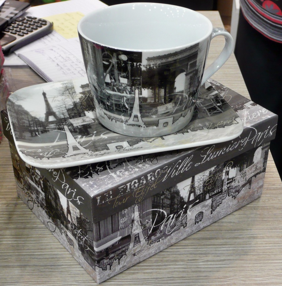 To start your day off beautifully, a large porcelain cup and saucer, transfer printed with black and white scenes of Paris perfect for any petit dejeuner.