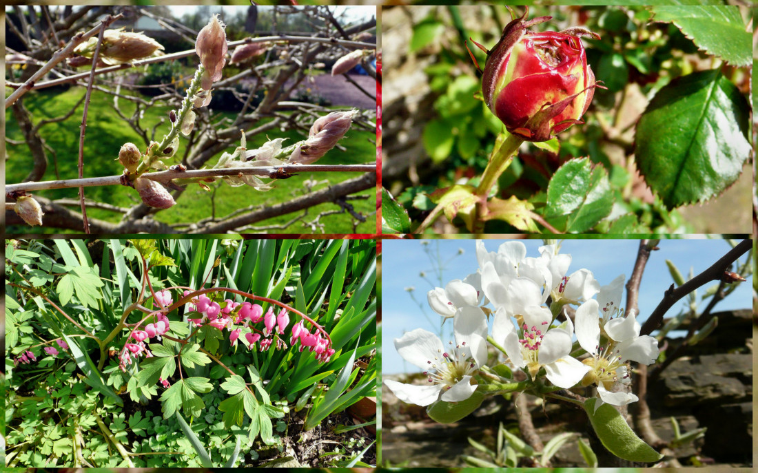 | Flowers are Red Click here for a beautiful, moving poem about red flowers. Joining Mary at the little red house for Mosaic Monday. Wishing you all a wonderful week! P.S. Blondie has asked me what the names of the flowers are, so........... the top two pix are of a red rhododendron that I rescued from the reduced (dying plants!) section at the garden centre a few years ago, the bottom right is a pieris plant also from the garden centre, (full price!) and the bottom left is a flowering quince bush that was here in the garden when we bought the house. |