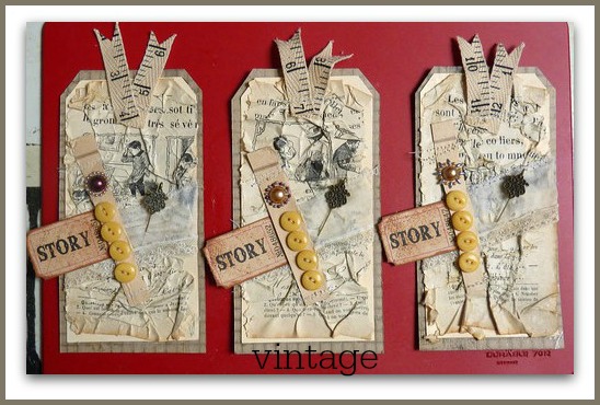 The centre tag above is the one I chose to begin my circle, on the left my take on the first prompt, on the right my final tag of the round.