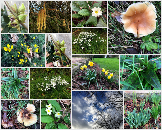 snowdrops; catkins, primroses, ajonc, wild orchid and late mushrooms in the lane