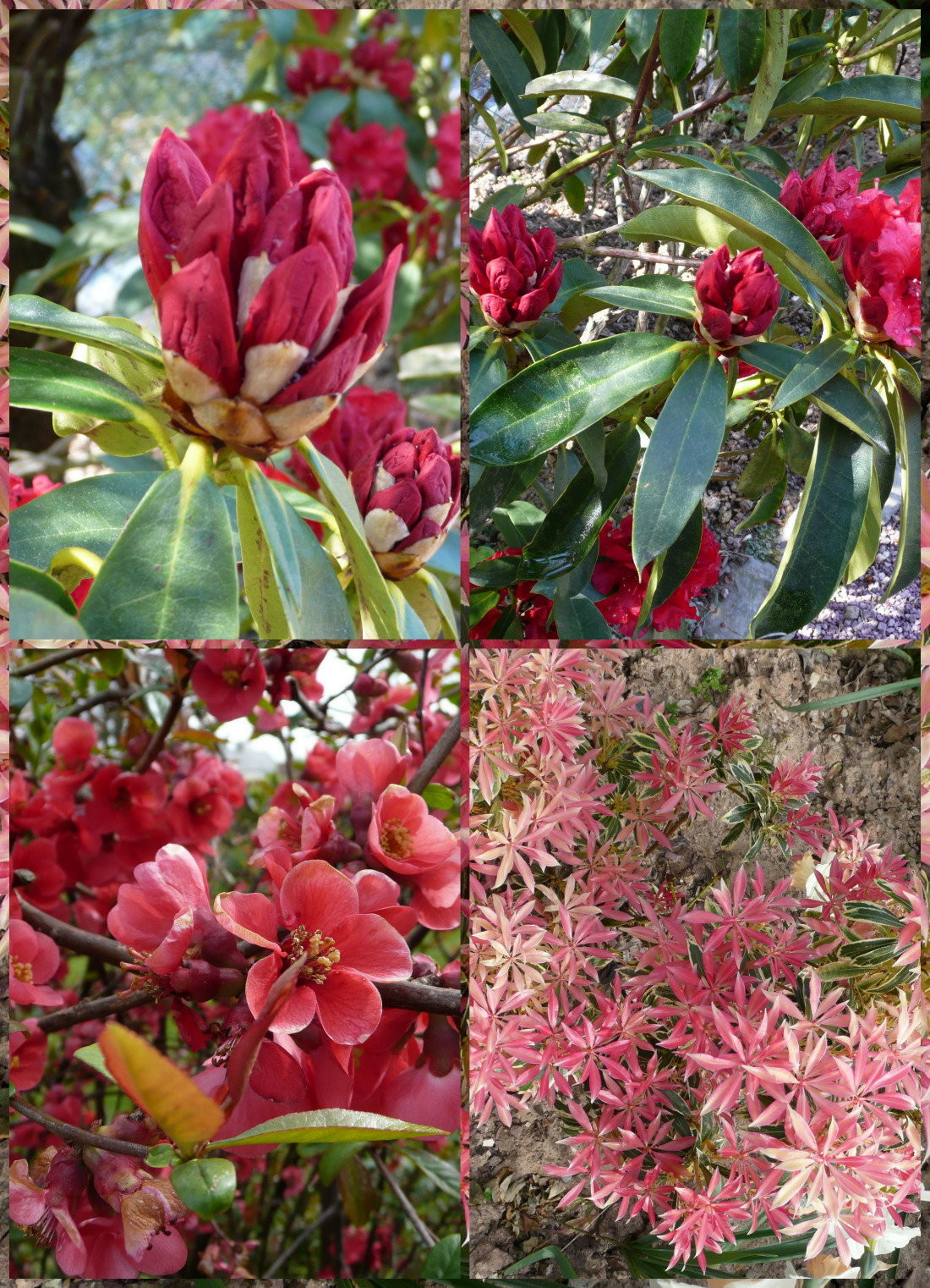 | Flowers are Red Click here for a beautiful, moving poem about red flowers. Joining Mary at the little red house for Mosaic Monday. Wishing you all a wonderful week! P.S. Blondie has asked me what the names of the flowers are, so........... the top two pix are of a red rhododendron that I rescued from the reduced (dying plants!) section at the garden centre a few years ago, the bottom right is a pieris plant also from the garden centre, (full price!) and the bottom left is a flowering quince bush that was here in the garden when we bought the house. |